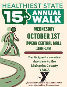 Penn Central Mall has partnered with our local Mahaska County YMCA to join the 15th annual healthiest state walk on October 1st from 11am-1pm! Come walk the mall and receive a day pass to the Y! Walk with us to promote physical and mental health well-being!