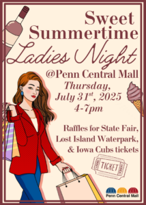 Join us at Penn Central Mall for another ladies night!! Shop, relax, and enjoy an evening with your gal pals! Raffles for State Fair, Lost Island Waterpark, and Iowa Cubs tickets are up for grabs!